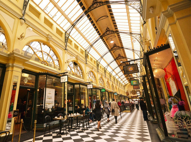 The Royal Arcade, Melbourne's oldest commercialstreet, is Melbourne's prettiest shopping mall, apiece of art. It is small but exquisite, with manyspecialty shops,such as tarot shops, specialtycafes, and specialty stores. There is a very smallrestaurant on both sides of the narrow alley in theback street exit. Here you can find a small tablewit,h friends for asmall glass of wine, some cheesewith bacon, and a local feeling.