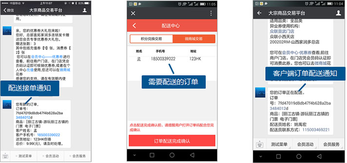 客户端客户下单邮寄配送方式,订单的调度员可将订单分配给默认配送员、指定的配送员。系统会向配送员的移动端发送订单配送通知,订单开始配送,客户移动端会收到订单配送的通知信息;配送员在移动端的[配送中心、,可查看并确认配送完成。
